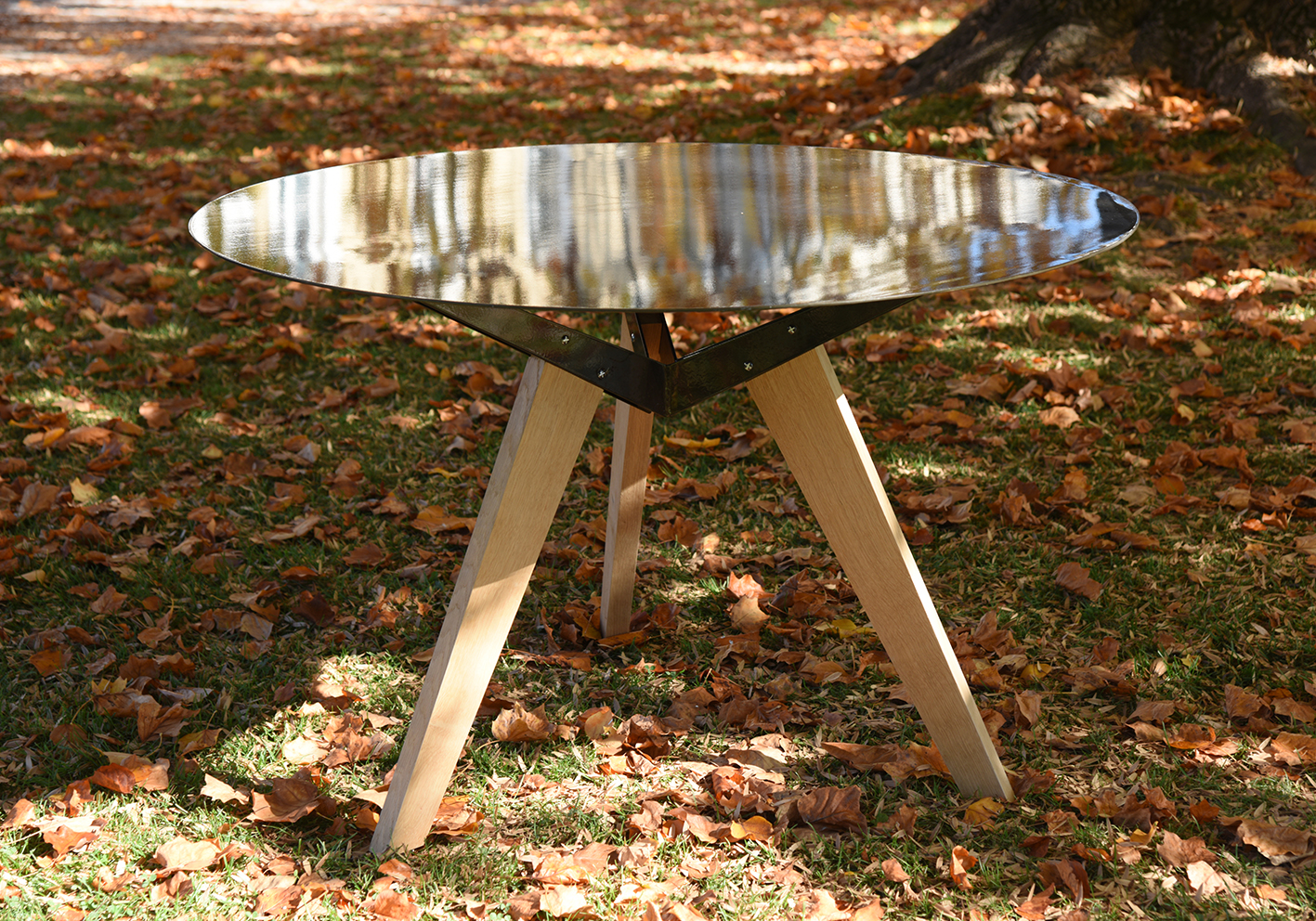 Cette table a été dessinée pour le caveau de dégustation du domaine de la Pinthe à Arbois dans le Jura. La matérialité de la table vient de son rapport au lieu, au parquet en chêne du sol que l’on ne veut pas rayer, au plafond à la française qui se reflète dans son plateau, au mobilier en acier qui l’entoure et que nous avions dessiné quelques années plus tôt. Sa forme ronde vient de ce rapport de distance qu’il existe entre des corps qui dégustent du vin.