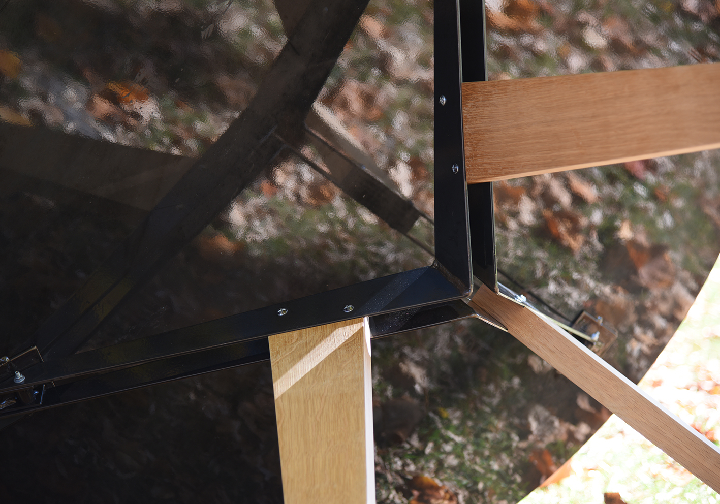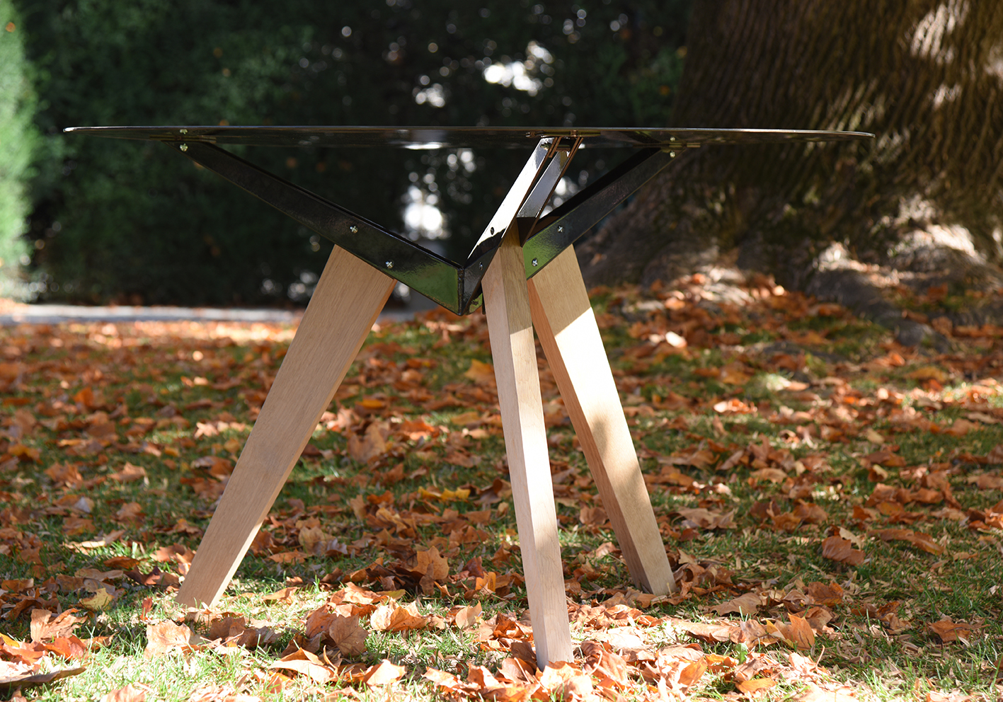 Le plateau est en métal brut de calamine vernis. Il a une profondeur mouvante qui permet au regard de se perdre. Il reflète le ciel et la lumière. Il y a comme quelque chose de contradictoire dans cette matière noire et lumineuse. En tôle épaisse, il teinte d’un son net et précis quand on y pose un verre.